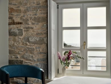 A comfortable 22 sq.m. room designed for your relaxation. A harmonious blend of Hermoupolis’ culture with contemporary touches, the A. Laurent offers discreet luxury. Here, the cool touch of the stone wall juxtaposes with the warm feel of the wooden floor underfoot. The sea view and access to the roof garden are some of the features that lend this room its unique charm. Furnishings and accessories from renowned designers, the restful sleep provided by the king-size bed, modern comforts offered by smart technology, and the bathroom’s modern design with the Dionysus and Oasis Verde marbles, underfloor heating, and the walk-in rain shower are all carefully selected to enhance the overall guest experience.