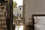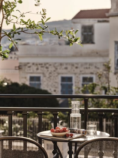A comfortable 20 sq.m. room designed for your relaxation. The room features a ceiling covered with an artistic sky mural, a balcony overlooking the courtyard and Ano Syros and luxe comforts for a pleasant stay. The queen-size bed has triple mattresses. In the bathroom, the white of the Dionysos marble complements the gray of the Hermes marble. All accessories are selected to enhance the overall guest experience.