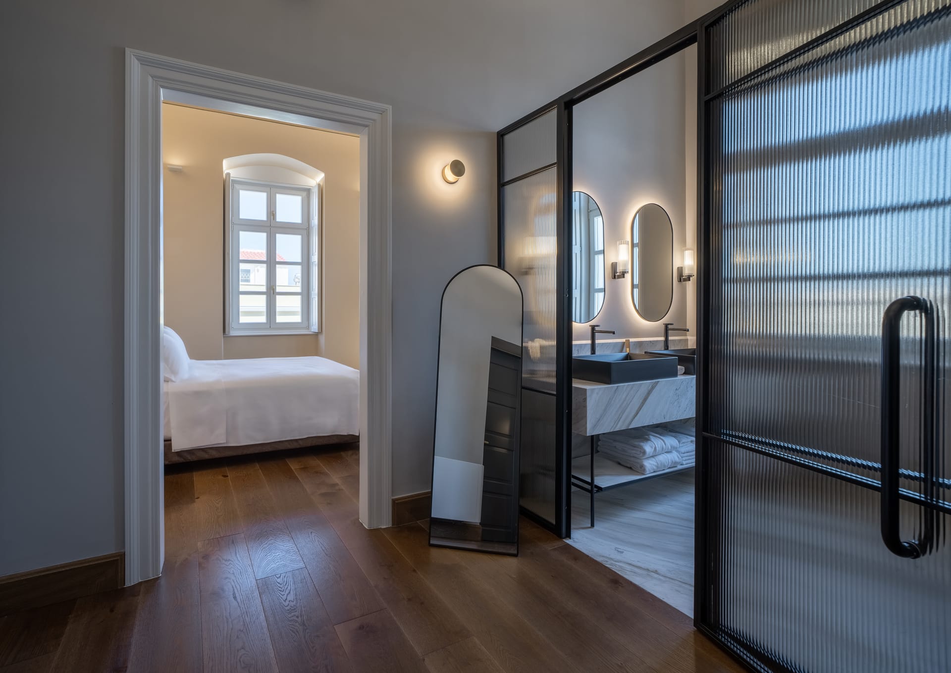 Elegant 34 sq.m. suite, ideal for your private retreat. The ceiling murals in both spaces of the suite depict mythical sea deities and landscapes, creating an ambiance that blends Greek mythology with European culture. The king-size bed is equipped with a triple-layered mattress system for restful sleep. Equipped with smart home technology and adorned with furniture from renowned brands and accessories by famous designers, the suite offers both comfort and aesthetics.